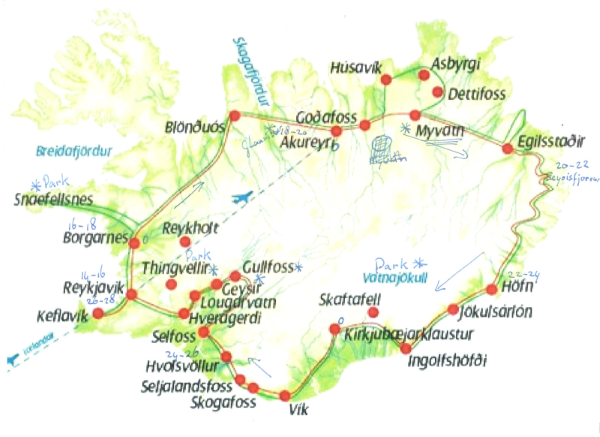 We hebben een 'rondje IJsland' gereden met de klok mee.
